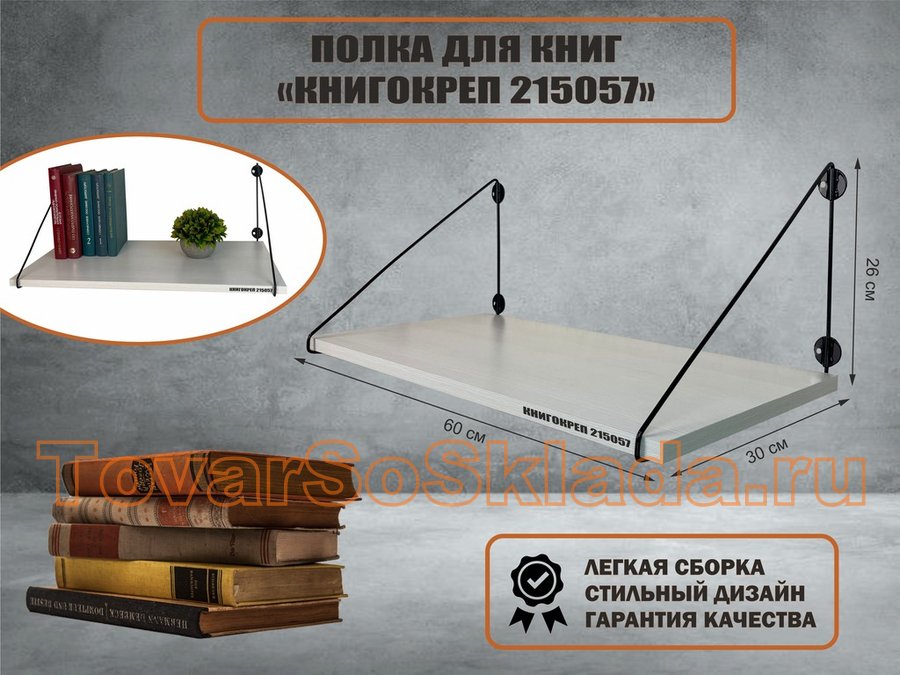 Полка для книг "КНИГОКРЕП 215089" высота 26 см размер 60х30 см белый и белый шагрень