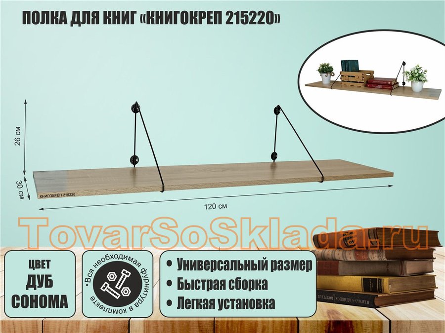 Полка для книг "КНИГОКРЕП 215220" высота 26 см размер 120х30 см черный и дуб сонома