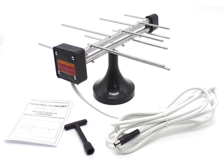 - "БАБОЧКА- 1А-5ВОЛЬТ" АКТИВНАЯ комнатная телевизионная антенна предназначена для приема цифрового DVB-T2 и аналогового телевизионного сигнала ДМВ диапазона