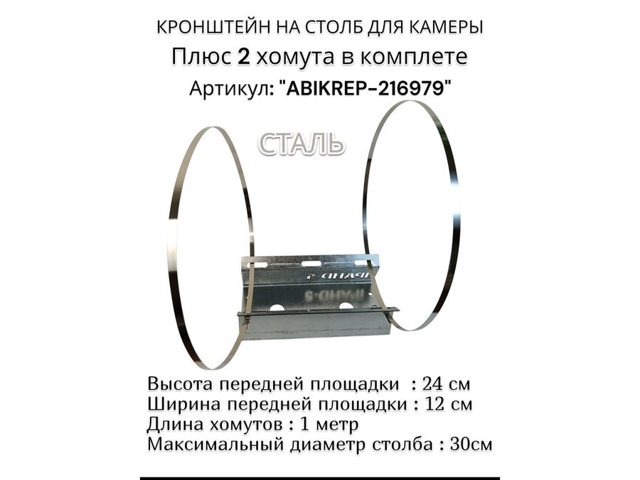 Кронштейн оцинкованный для камеры видеонаблюдения с хомутами на столб "ABIKREP-216979" 24х12см, 2отв