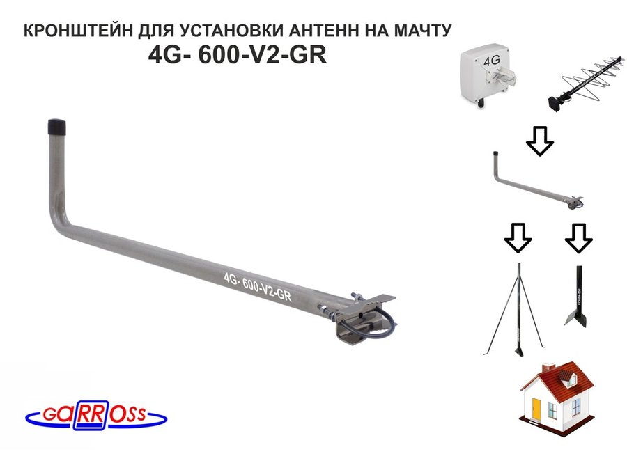 Кронштейн антенный "4G- 600-V2-GR" СЕРЫЙ; вылет 0,6м, диаметр 22мм, на трубу до 54мм, с хомутом