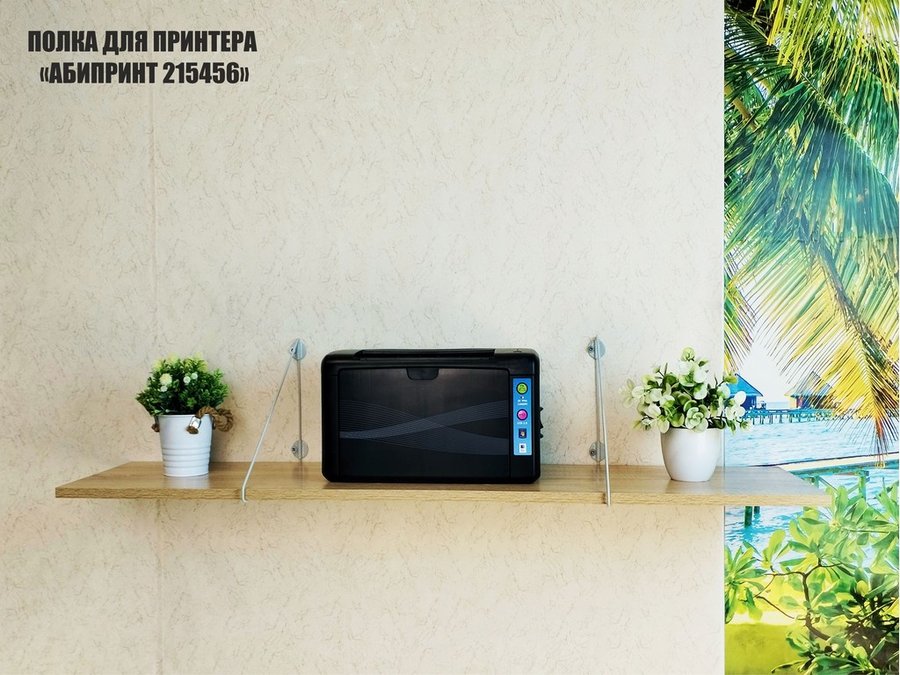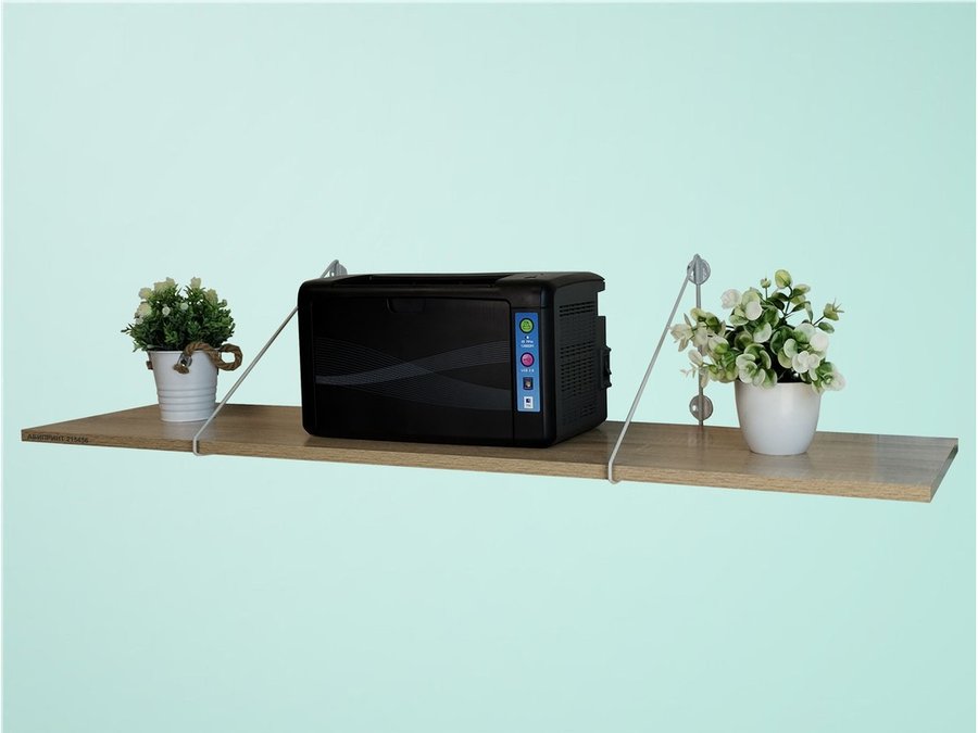 - Полка надежно крепится к стене при помощи анкеров или шурупов с дюбелями, на ней можно разместить принтер, бумагу